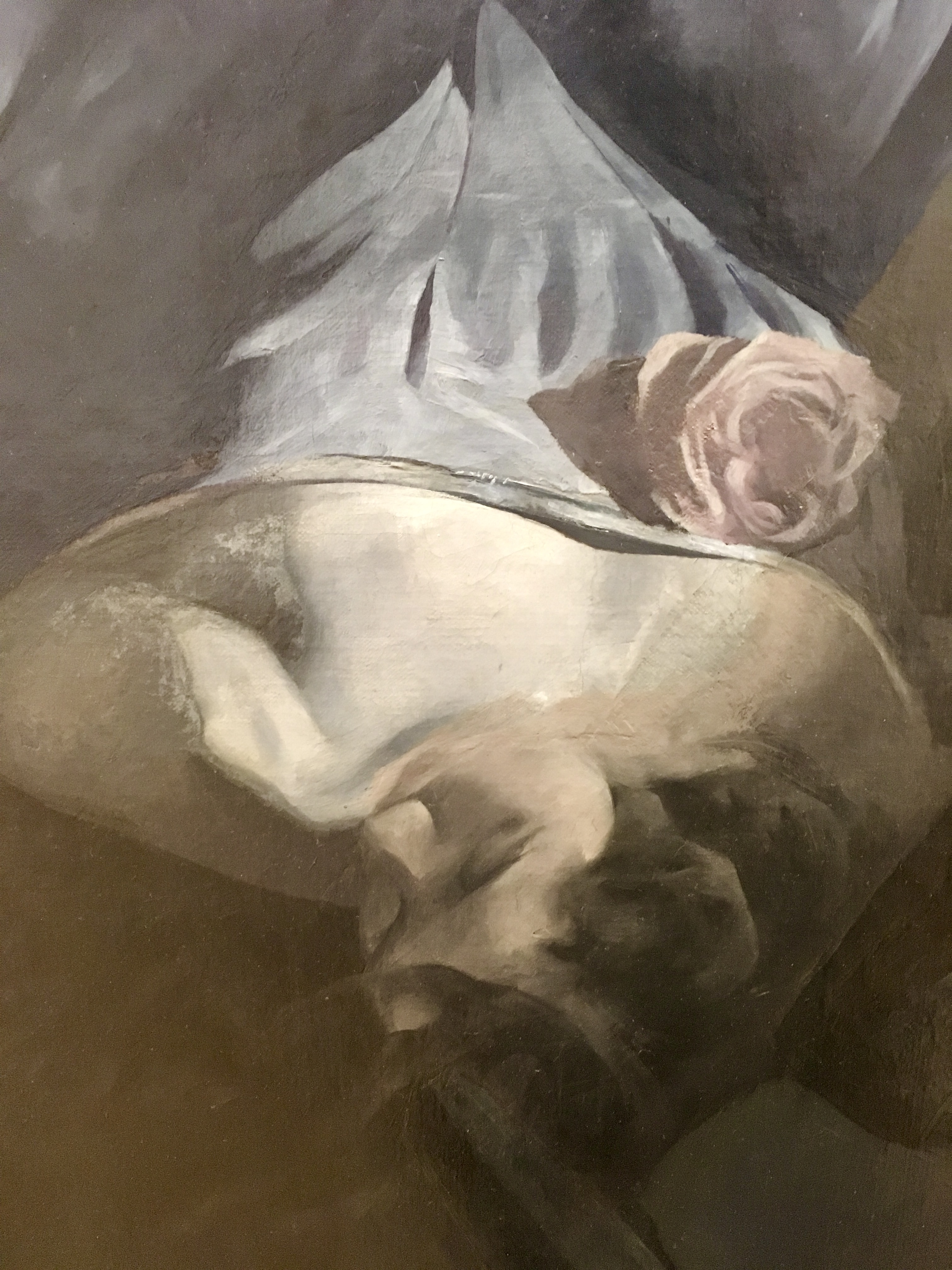 ED note, "The rose is a lillac [sic] colored one." letter to FD, June 20, 1960, he said "Woodland Scen(ic) Railway) would be as good a name." This painting was twice changed in size. It began as a 63 x 27, enlarged to 72 x 84, cut down to present 68 x 71. The draperies on Mrs. Marks were lent by EHS (FD).