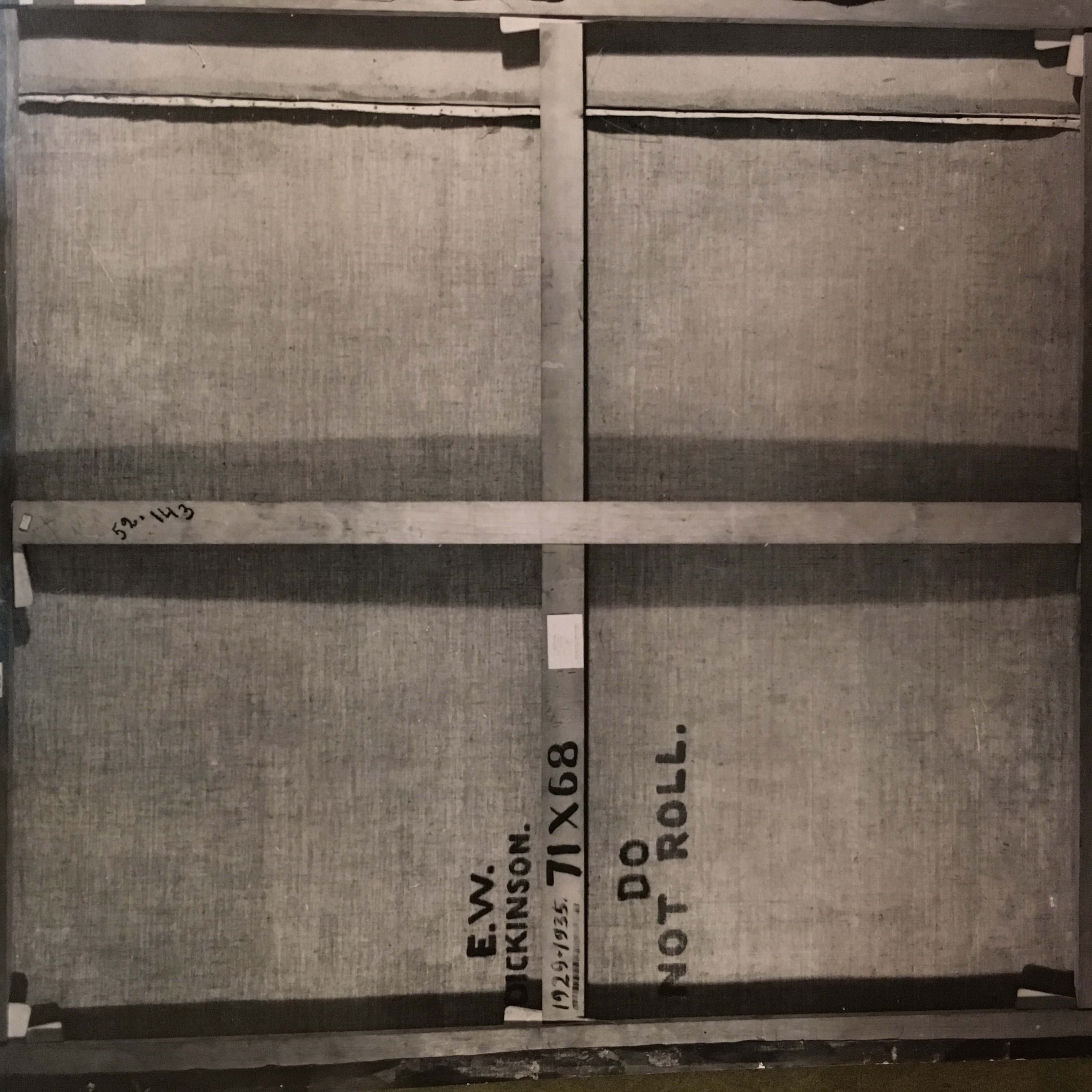 1935: January 20, accepted Esther's proposition on the 71 x 68, 21 planning the 71 x 68 (the old 63 x 72 and 84 x 72), 22, ordered stretcher, 23 preparations for 71 x 68, 24 ED & Pat stretched the 71 x 68, 25, 26, 27, 29, 30, 31, February 1, 4, 5, 6, 7, 9, 13, 14, 15, 16, 17, 18,19, 20, 24, 27 (32 sittings), AM "fini" 71 x 68. April 29, ED varnished it at the Albright where it hung with The Fossil Hunters.
