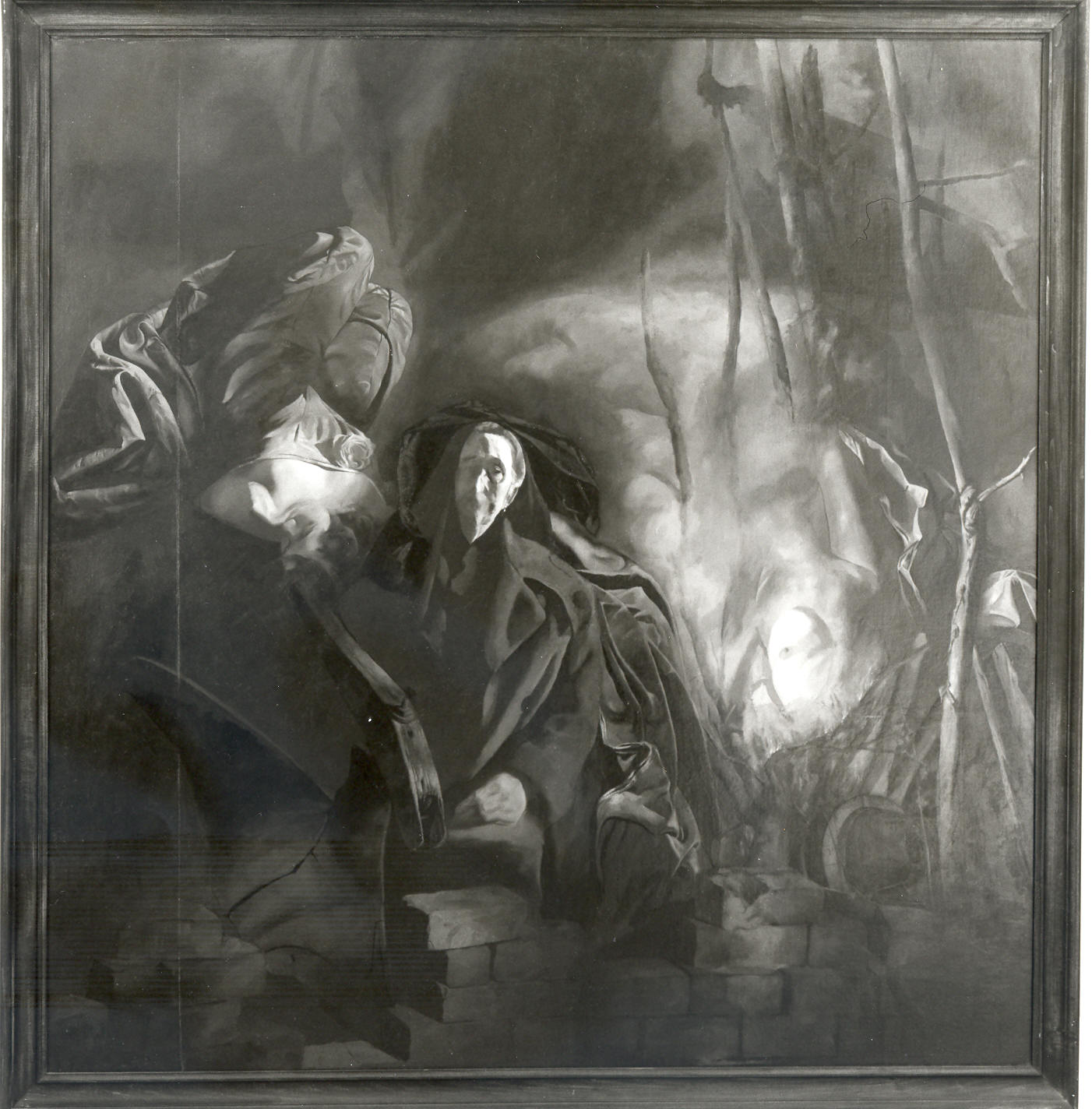 ED description of Woodland Scene: to Hilda Hoyt Potter. February 13, 1952."In the foreground, sits an old woman (she looks like a bearded old man) with a black shawl on her head. Near her, to the left, is a plow and some bricks. A figure behind her, to the left, is lying down 'head-on' and is wearing a purple low-neck tafetta dress. To the right, part of a nude torso is visible. Twigs, a little bonfire, tree trunks, clouds, and part of a wheel complete the picture. (Some ensemble !)" [Courtesy Roderick Potter, Jr.].
