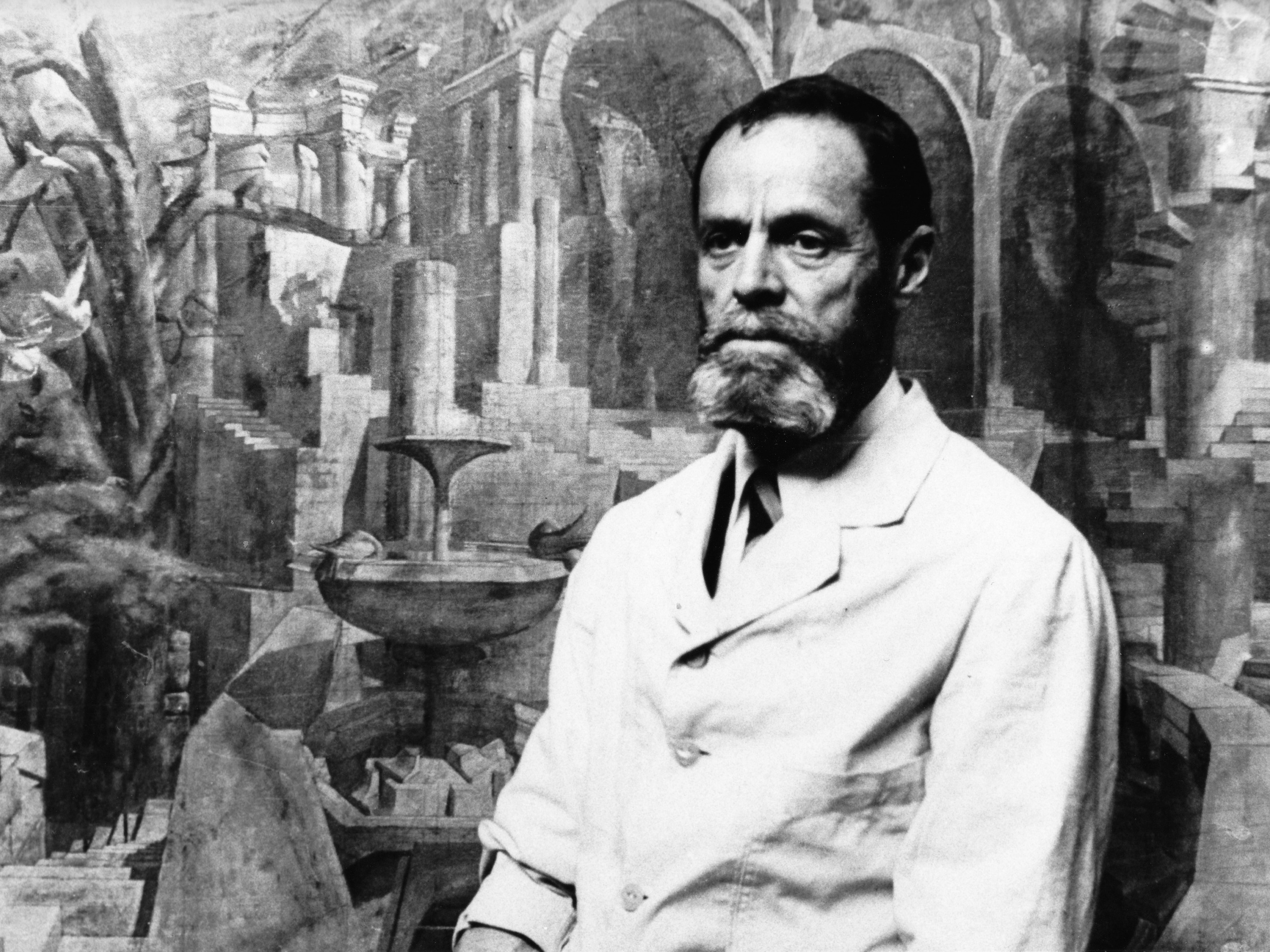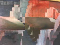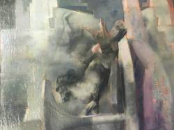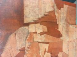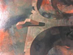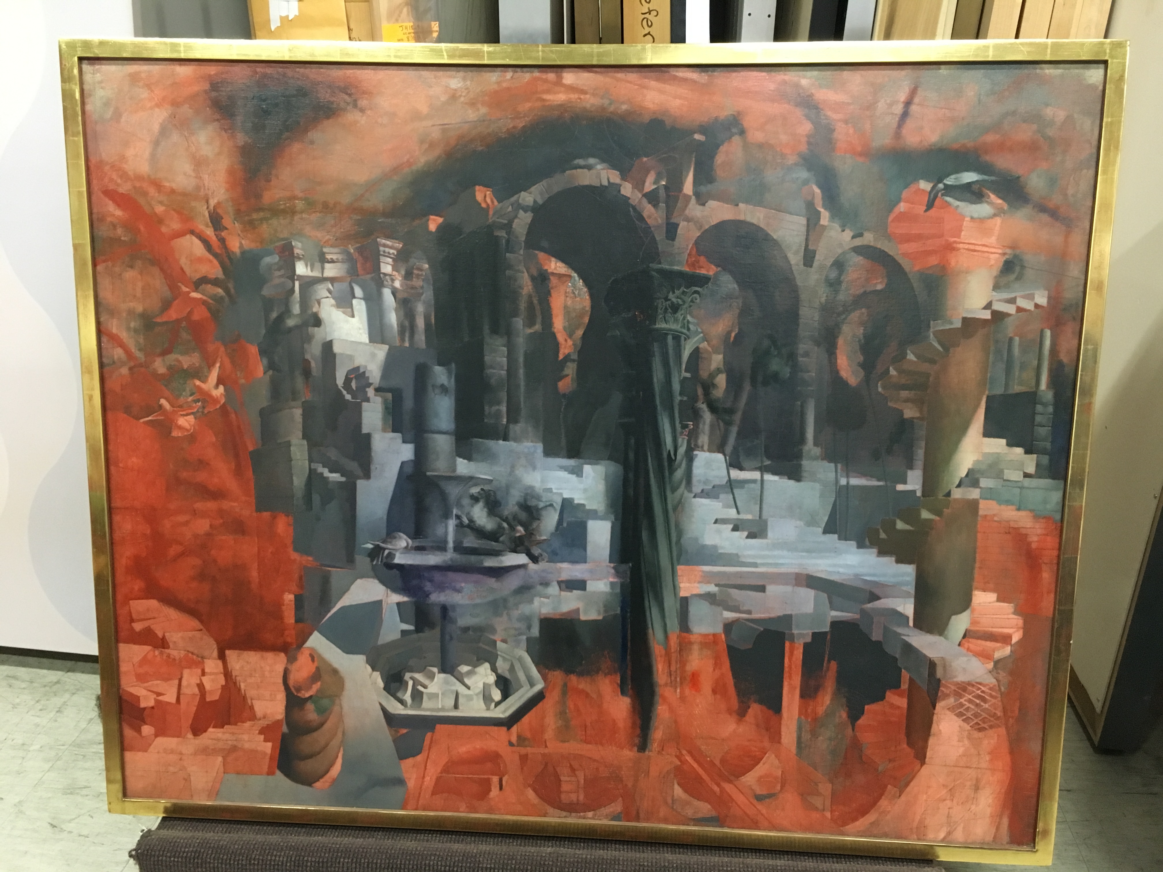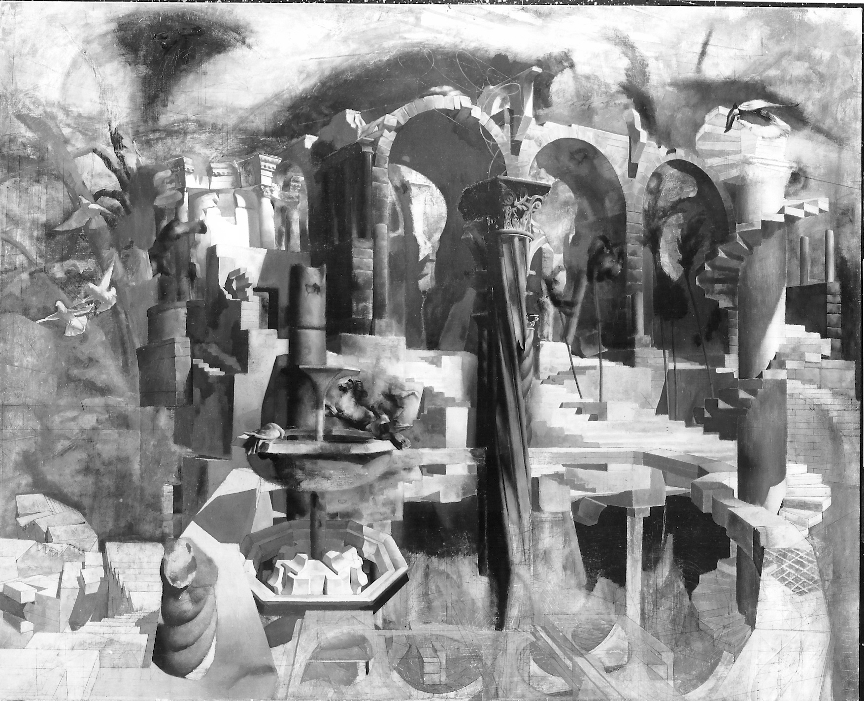 1944: To Tibi, January 11;"I have a good sized 60 x 48 camvas under way - one which you will like, I think. It is a drawing only, as yet, in pink paint (in mass, not in line). In the foreground is a calm pool in which is reflected, in the order of distance from the observer: a Grecian marble urn, a Roman collonade [sic] supporting 4 broken & 4 complete arches; a large French mansion of 1800, connected by a 'bridge of sighs' with a french feudal keep. Above these reflections, of course, the reflected objects appear. There will be many more (objects); trees, rocks, sky , etc. I have no models; I have the patience and I can invent pretty well. I plan to keep it to a drawing for some time yet, & only commence to paint when I have the trellis, on which to hang the chiaroscuro, completed. I have had 48 sittings on it." 1944 To Tibi, January 18; "One of the pillars in the painting now has a staircase flung around it."
