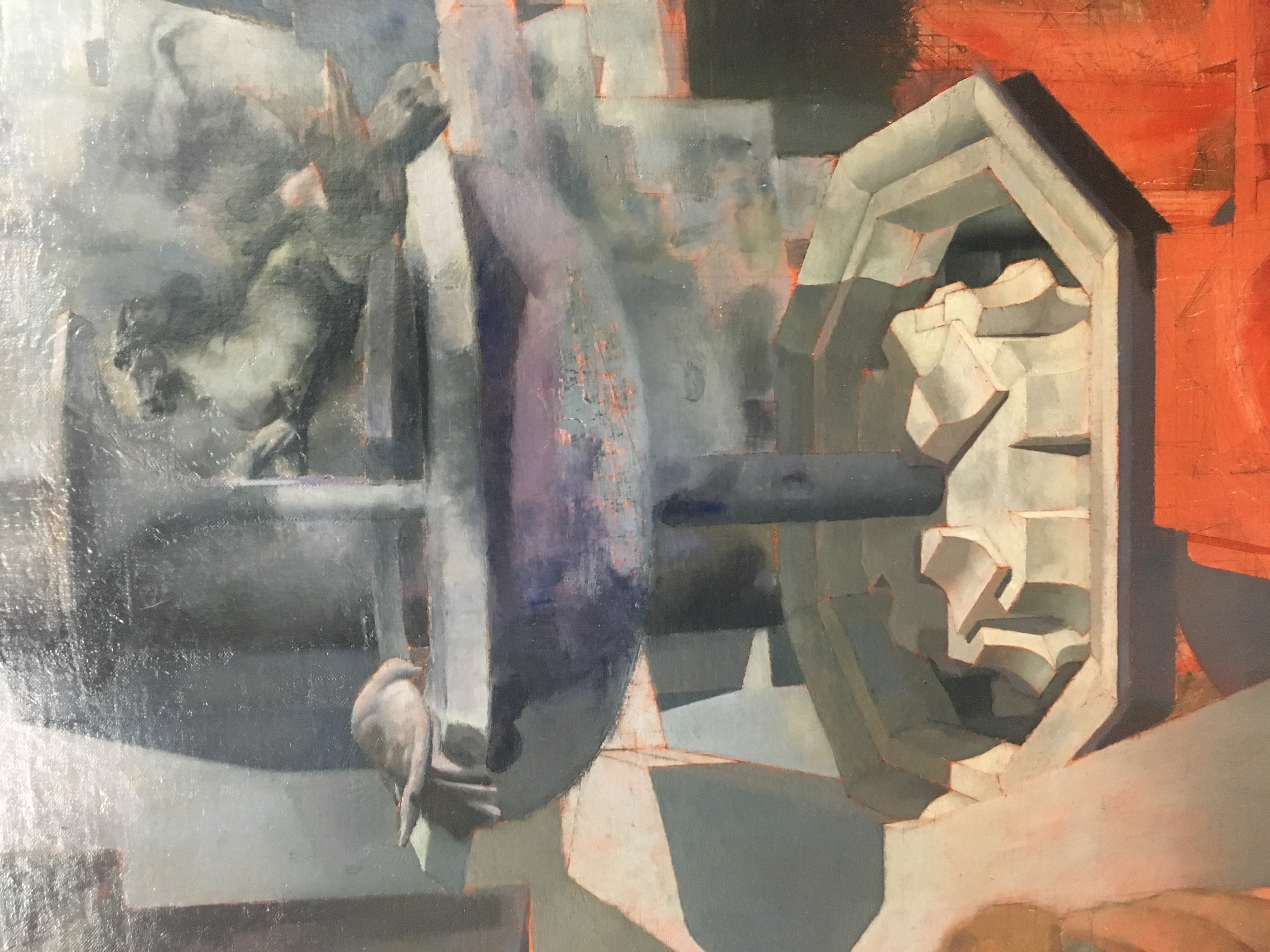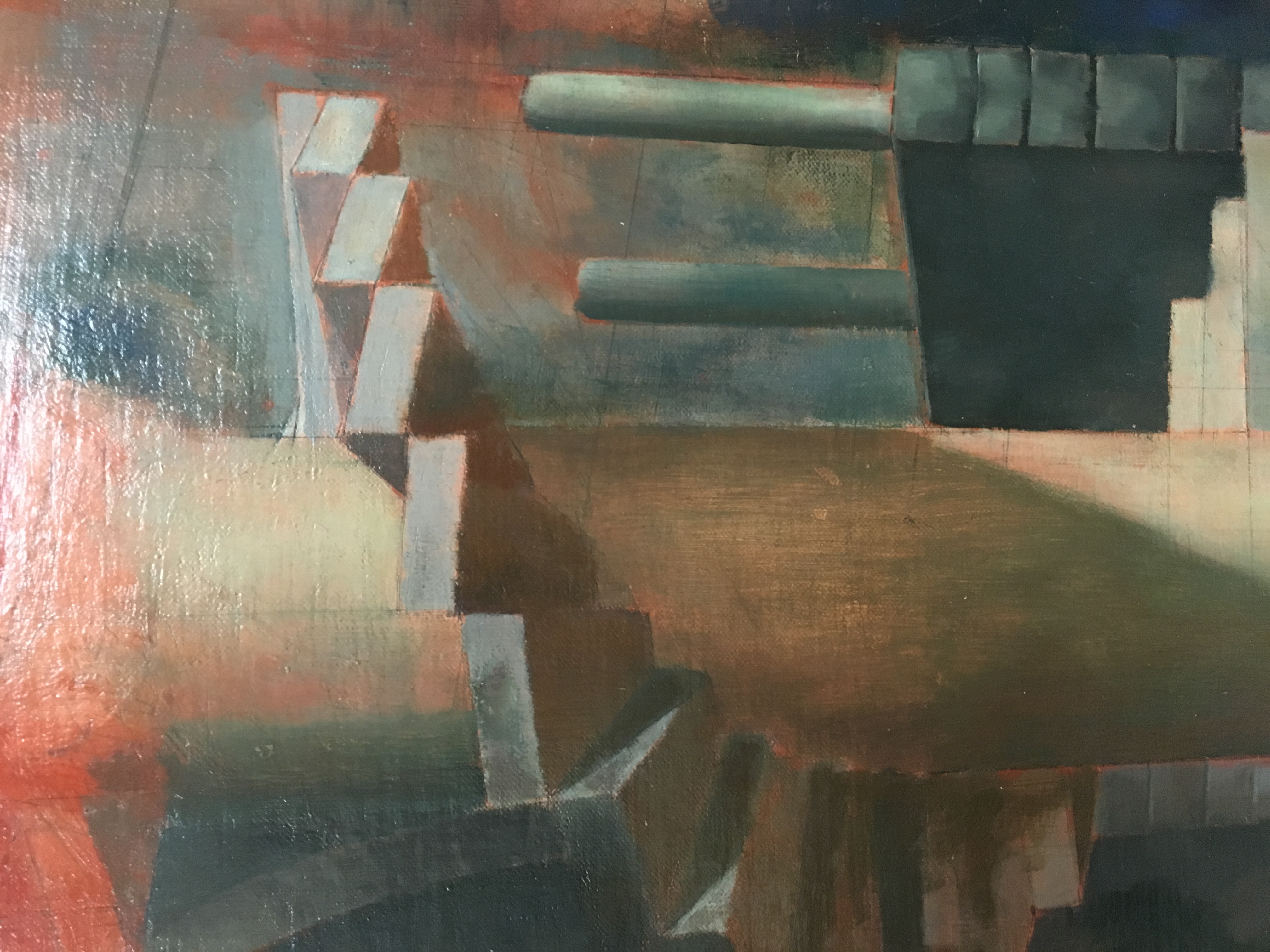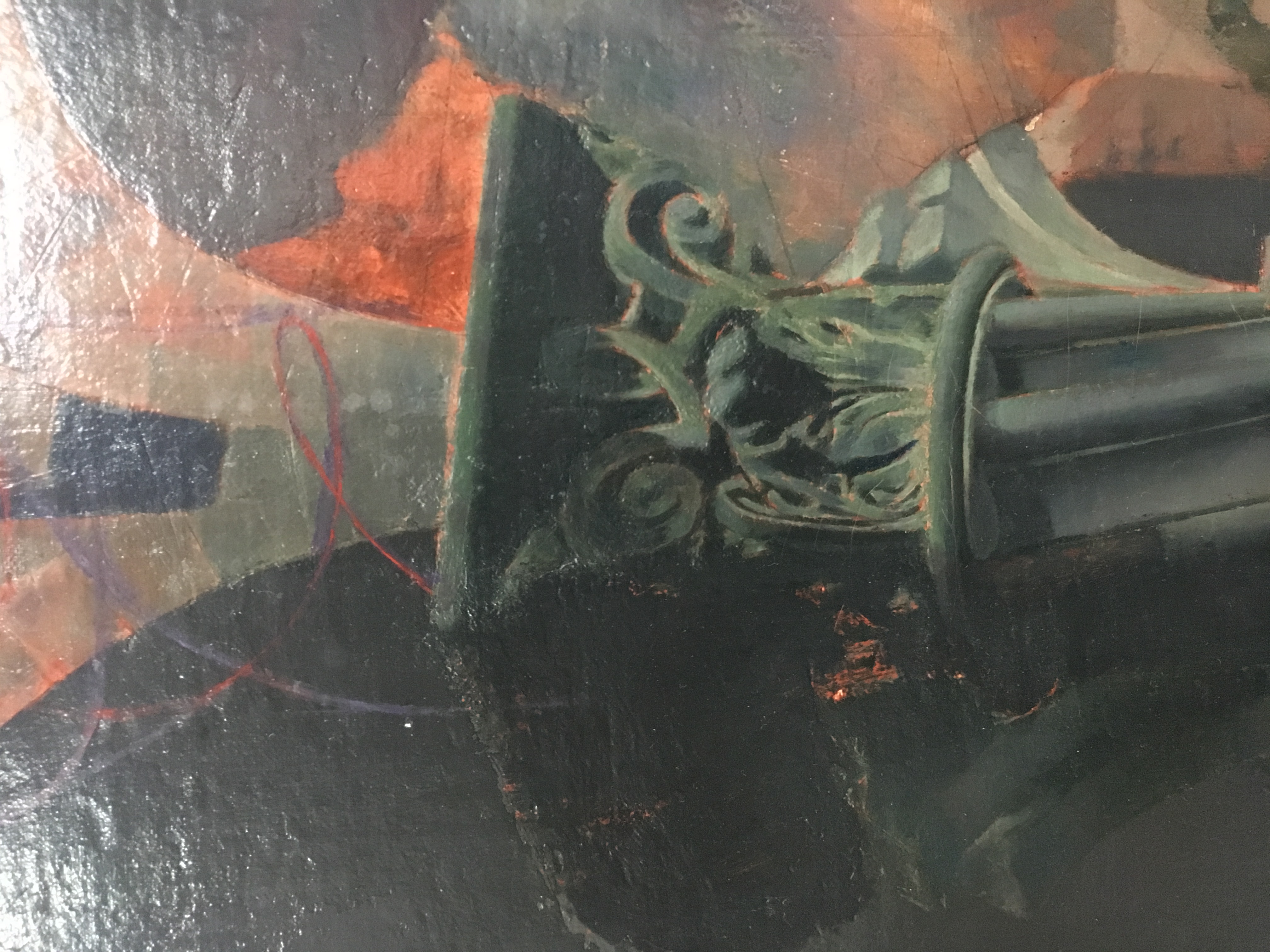 1944: To Tibi, January 11;"I have a good sized 60 x 48 camvas under way - one which you will like, I think. It is a drawing only, as yet, in pink paint (in mass, not in line). In the foreground is a calm pool in which is reflected, in the order of distance from the observer: a Grecian marble urn, a Roman collonade [sic] supporting 4 broken & 4 complete arches; a large French mansion of 1800, connected by a 'bridge of sighs' with a french feudal keep. Above these reflections, of course, the reflected objects appear. There will be many more (objects); trees, rocks, sky , etc. I have no models; I have the patience and I can invent pretty well. I plan to keep it to a drawing for some time yet, & only commence to paint when I have the trellis, on which to hang the chiaroscuro, completed. I have had 48 sittings on it." 1944 To Tibi, January 18; "One of the pillars in the painting now has a staircase flung around it."