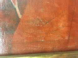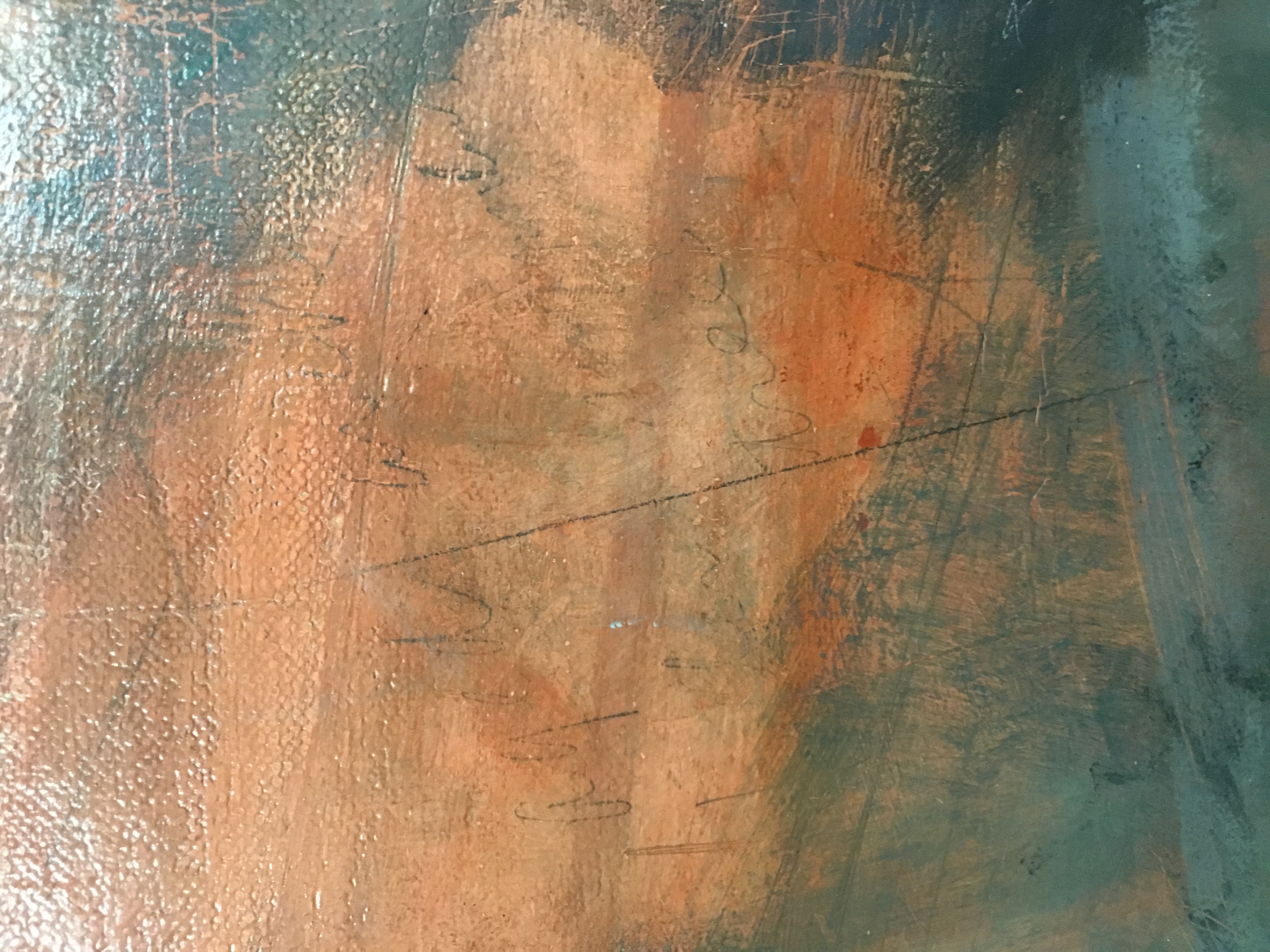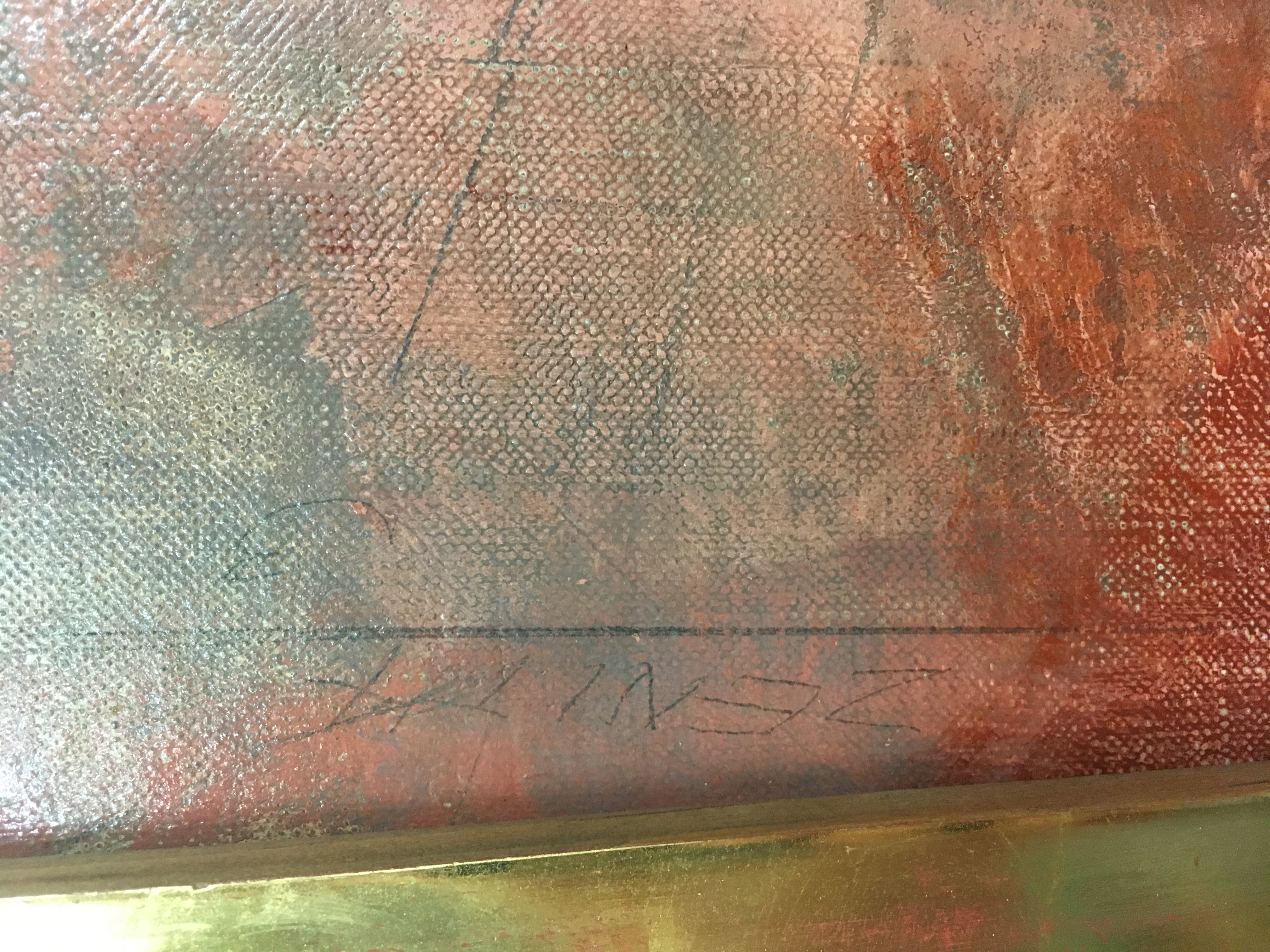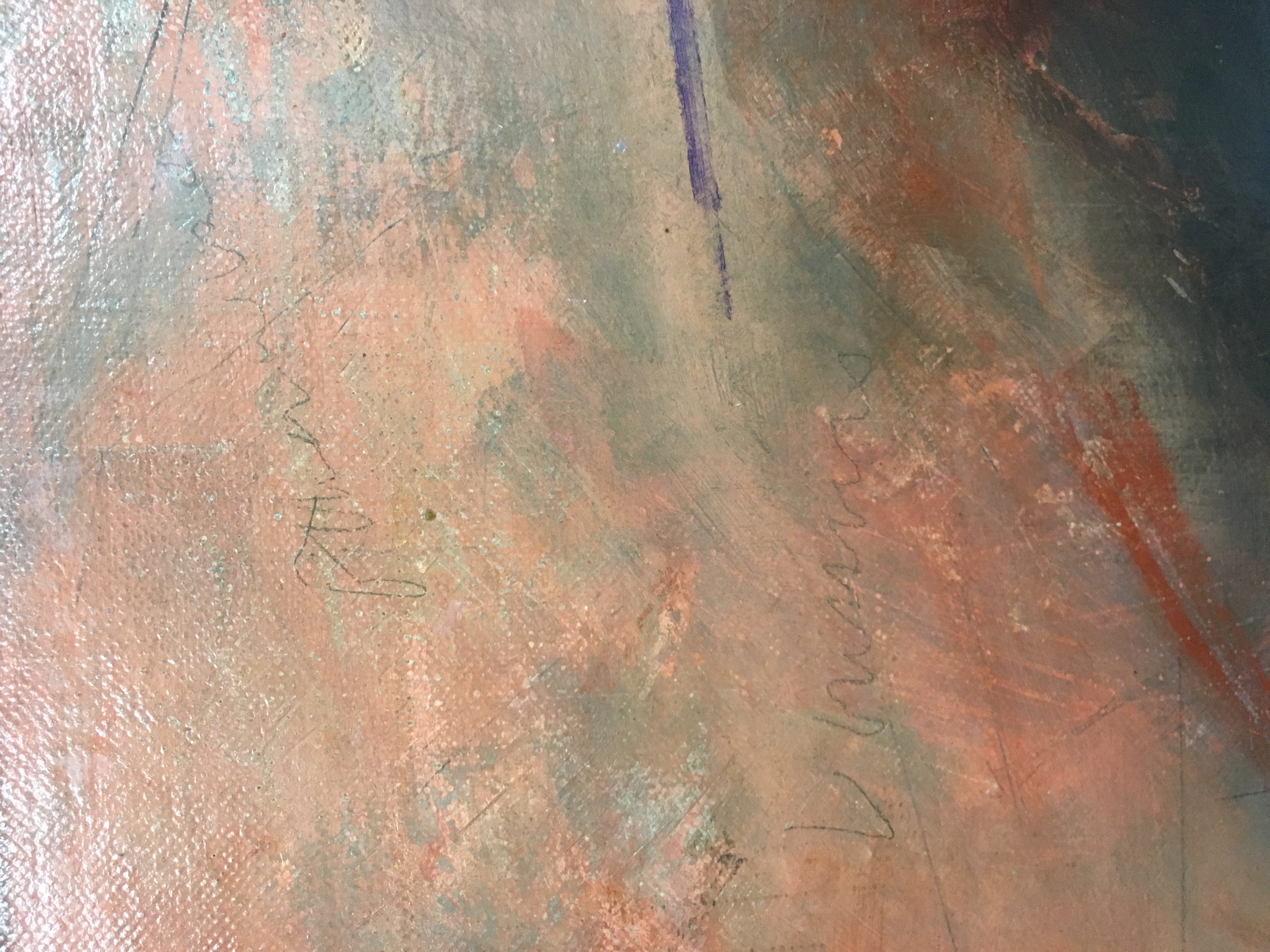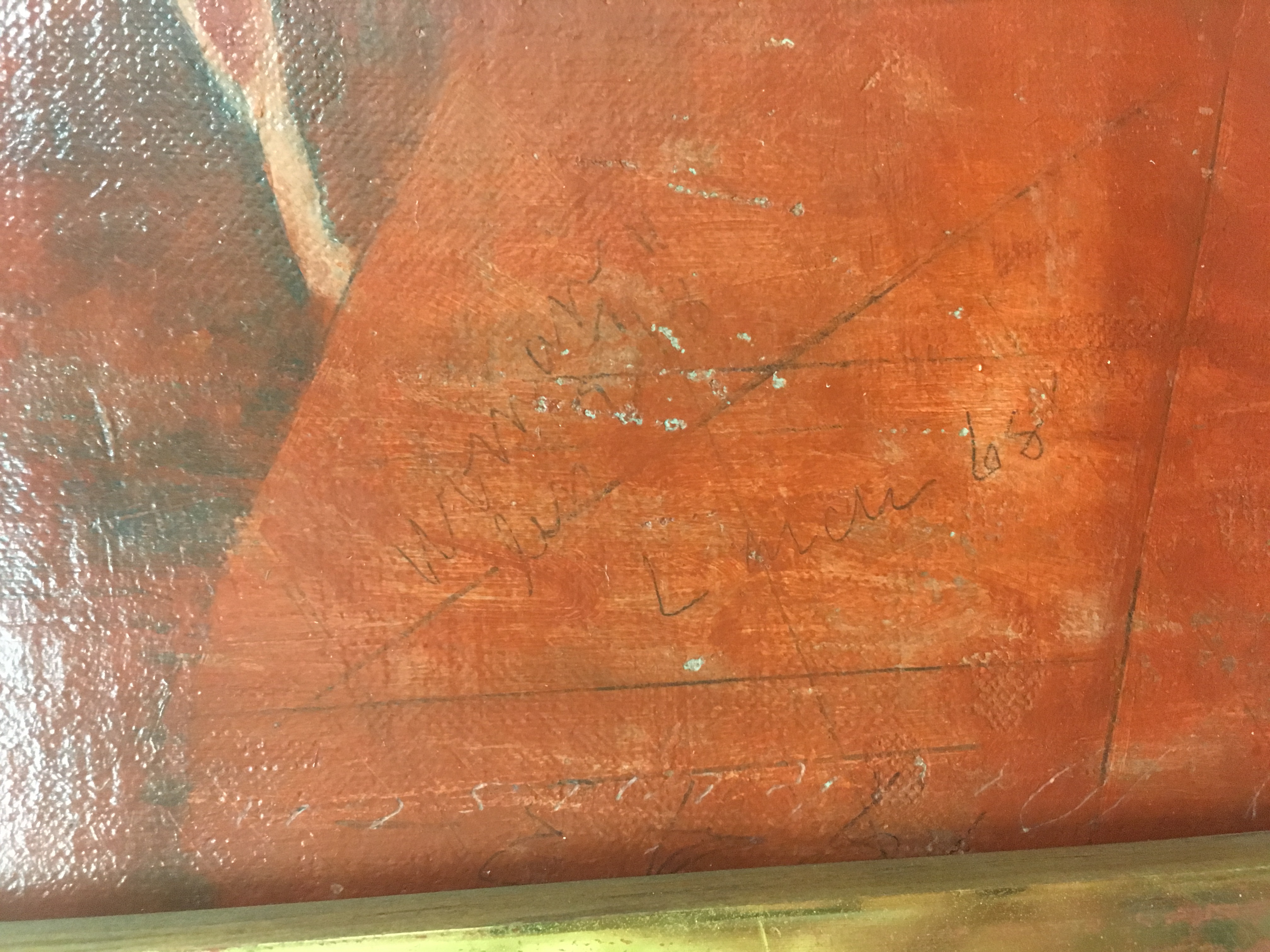 1954: June 9 At Institute "looked carefully at back front on all edges 60/48. New linen backing & stretcher (heavy); heavy varnish." June 10 "Decided to name the 60/48 "Ruin at Daphne" [sic] (journal). Cons and I PM to Inst. signed 60/48 & labeled it.