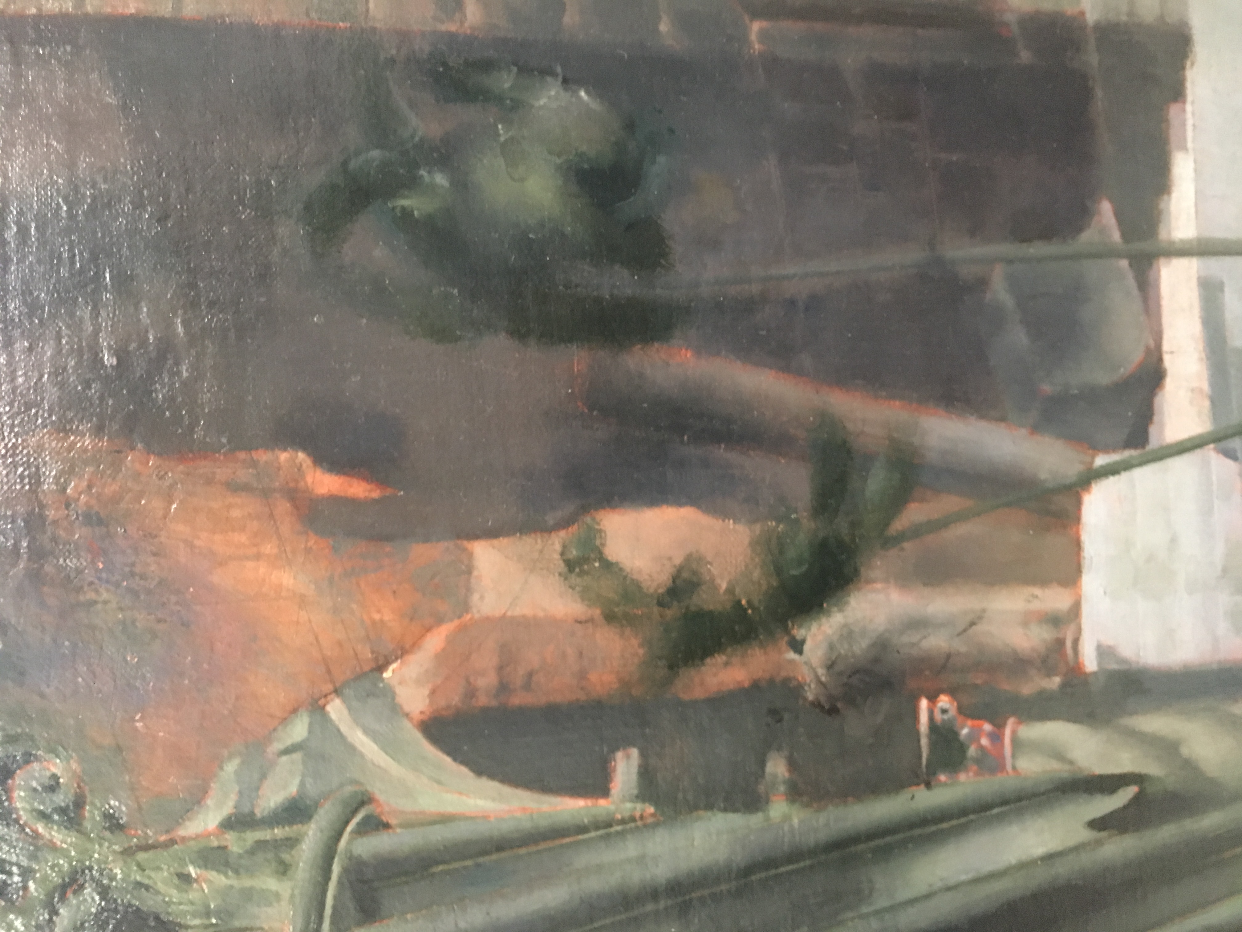 FD note: ED loved to paint objects in reflection and did so all he could in the "Daphne." There are imaginary reflections of imaginary structures, stairs, pillars, vaults of imaginary ruins at an imagined Daphne. In a foreground pool there are also reflected structures which are not above it. Sometimes there remain reflections of structions that have been painted out.
