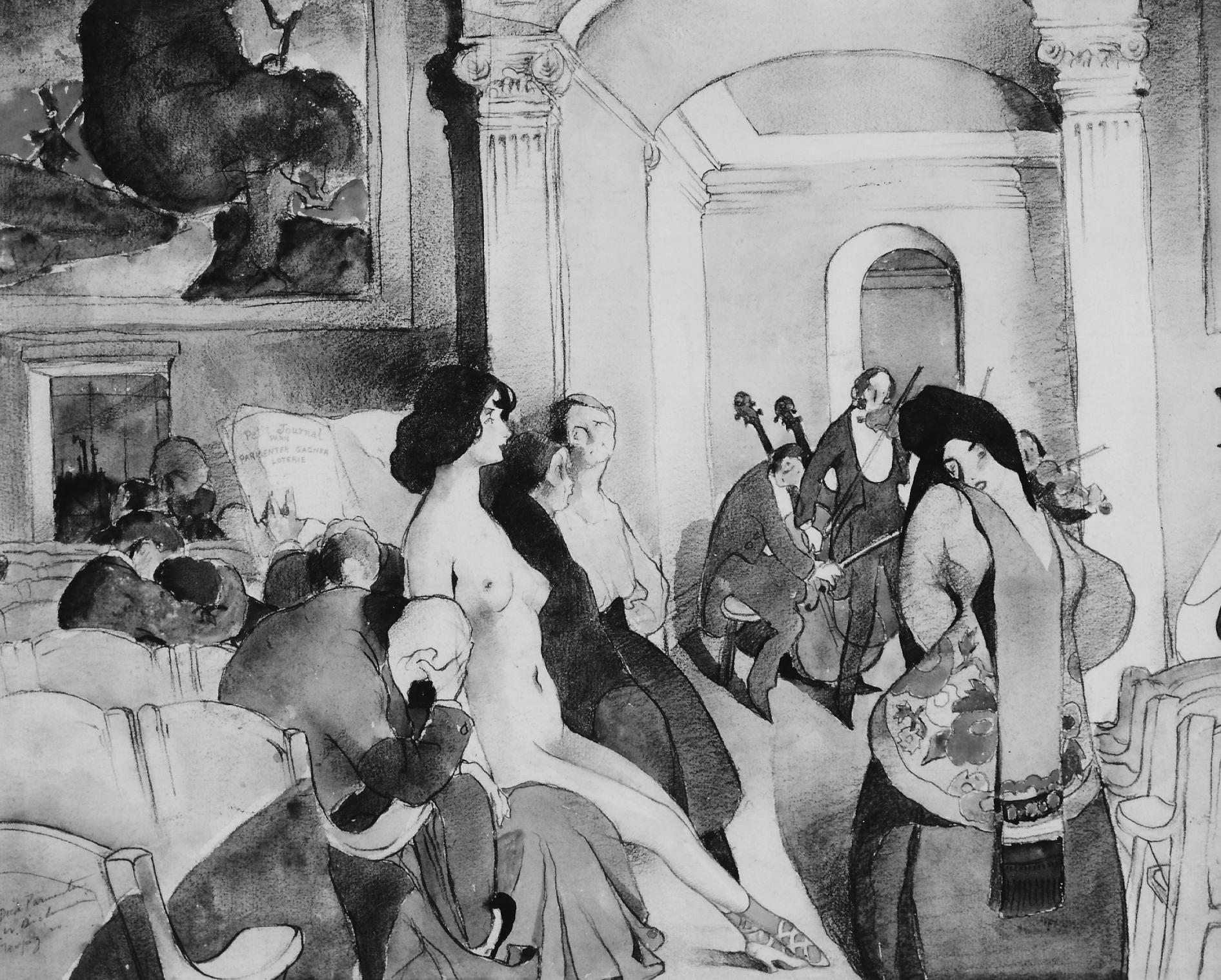 Painted in St. Tropez, France, in April or May as a gift to the Parmenters (journal). Dick (Richard) and Belle (Isabella) are portrayed at left as newlyweds attending a Concert Touche at which they are so absorbed embracing that they neither hear the music nor see the fully displayed nude. Nor do they see the newspaper of the man immediately to their right which reads: "Petit Journal / Paris / Parmenter / Gagner / Loterie" [Parmenter Wins Lottery]. Dick and ED became fast friends when they met January 3 at the Closerie de Lilas, Paris.Provenance