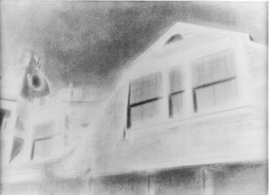 A drawing which Dickinson made of the South Wellfleet Inn in 1939 just before that hotel burned is used as the subject of the painting, South Wellfleet Inn, 1955–60. This painting is large and one in which Dickinson composed the subject matter to make his point rather than “the site taken as seen.” In the painting, the view of the building is repeated several times as the images cascading in ever smaller copies to the bottom of the frame. It is a graphic contradiction using two different indicators of depth; an apparent diminution in size indicating depth in contrast to overlapping. It is a graphic contradiction using two different indicators of depth; an apparent diminution in size indicating depth in contrast to overlapping.